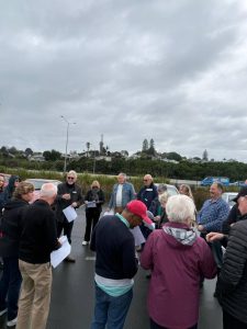 At Drury we swing on to the desolate Southern Motorway bound for The Northern Manukau Coast Scavenger Hunt. The Manukau Interchange comes up; we change motorways heading towards Onehunga looking for the Taumanu Reserve. The roads get narrower and narrower, we crawl past a tiny café serving coffee which can be enjoyed by sitting on rusty metal chairs under a dripping veranda, no time for this luxury and the car plunges down a steep slope to the troubled shores of the Manukau Harbour.